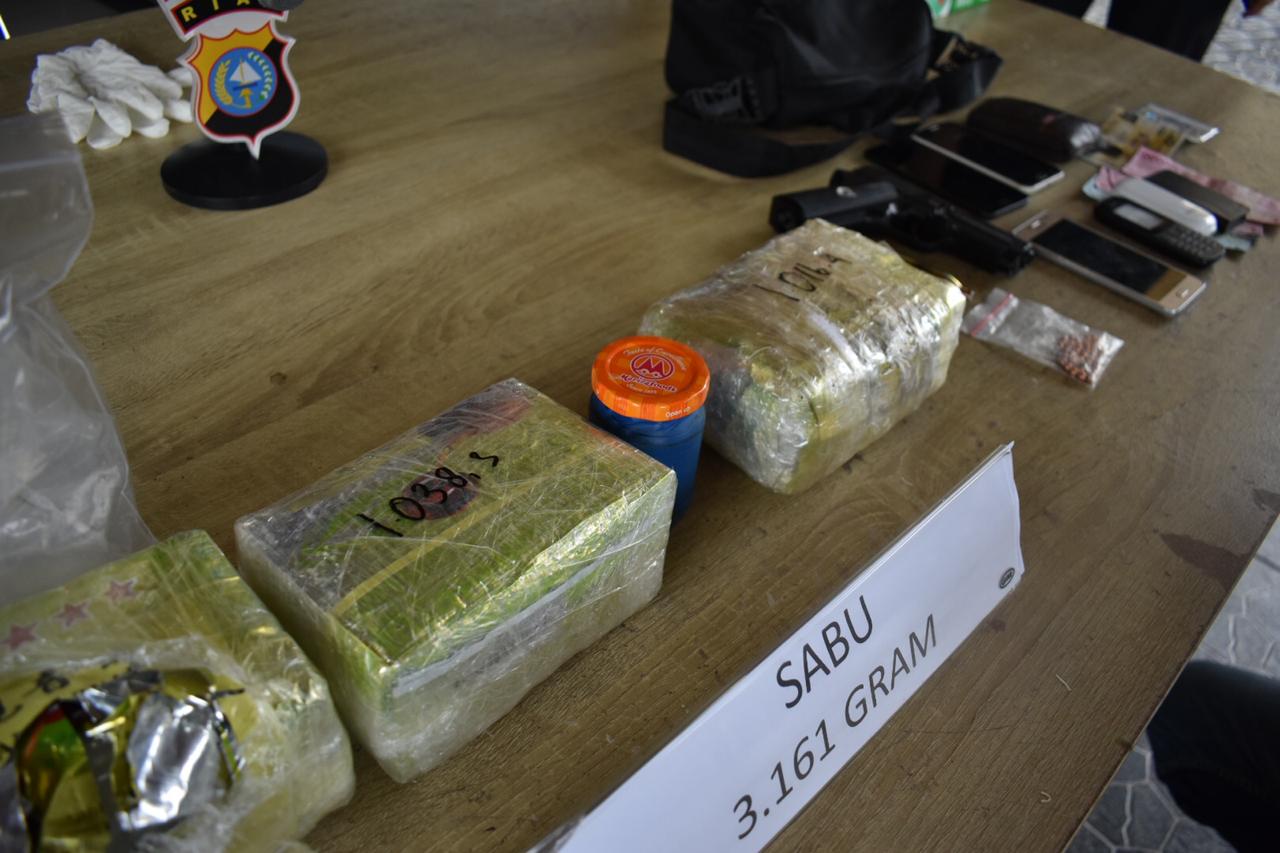 Untuk seluruh barang bukti yang kita amankan dari 4 tersangka yang ditangkap SatRes Narkoba Polresta Pekanbaru yaitu sabu seberat 3,161 kg, uang tunai Rp.500.000, 1 unit mobil Avanza warna hitam dan 1 buah senjata air soft gun beserta peluru.