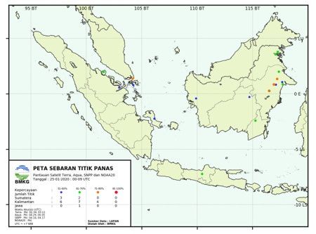 LancangKuning.com, PEKANBARU - Badan Meteorologi, Klimatologi, dan Geofisika (BMKG) Stasiun Pekanbaru mencatat ada sebanyak tiga titik panas (hotspot) yang tersebar di Provinsi Riau, Sabtu (25/1/2020) sore ini.
