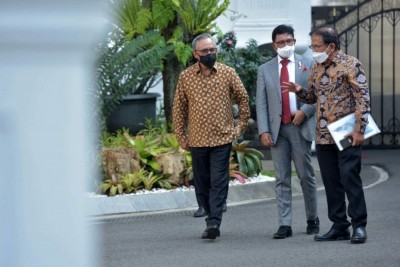 Foto: Ketua Dewan Komisioner OJK, Menkominfo Johnny G. Plate, dan Menteri ATR/Kepala BPN Sofyan Djalil di Istana Kepresidenan Jakarta, Jumat (15/10/2021) (Foto: Humas Setkab/Jay)