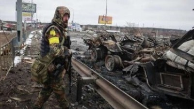 Foto: Pria dengan senjata dan kendaraan perang Rusia yang hancur di Bucha, Ukraina. (AP Photo/Serhii Nuzhnenko)