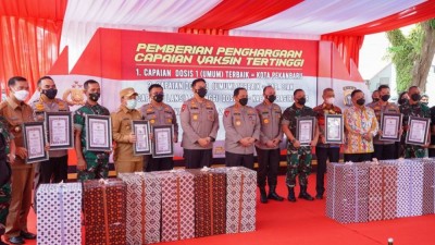 Adapun empat daerah yang mendapat penghargaan dari Wakapolri diantaranya: Kota Pekanbaru dengan capaian target vaksinasi dosis pertama terbaik yaitu sebanyak 859.119 dosis atau 114, 84 persen, Kabupaten Siak dengan capaian target vaksinasi dosis kedua terbaik yaitu sebanyak 256.286 dosis atau 74,57 persen.