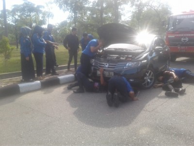 Tampak cukup lama, bahkan petugas rela menyelamatkan anjing kecil mungil yang berada dibawah mobil dan masuk kedalam rangka.