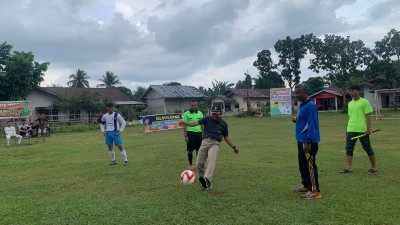 Foto: Kepala Desa Salo Timur, H. Tukiran saat membuka sekaligus tendangan pertama Turnamen Sepakabola Mini tingkat Desa, Lapangan Kerawai Desa Salo Timur, Kamis (3/11/2022).