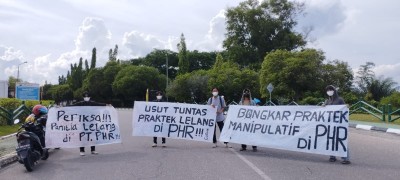 "Kami medesak periksa panitia lelang, karena banyak indikasi lelang-lelang di PR PHR banyak yang dimanipulatif demi kepentingan perusahaan asing," ujar Koordinator Lapangan MARAK Agel Gandiza setelah aksi.