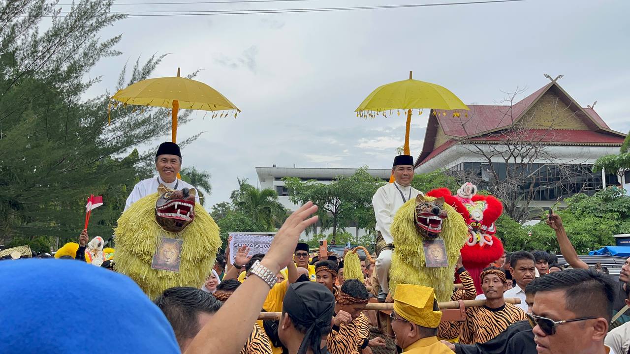 LANCANGKUNING.COM,Pekanbaru-Selasa (27/8/2024) ribuan relawan dan simpatisan mengantarkan pasangan calon Gubernur Riau Syamsuar dan  calon Wakil Gubernur Riau, Ustad Mawardi mendaftar ke Komisi Pemilihan Umum (KPU) Riau di Jalan Gajah Mada, Pekanbaru.