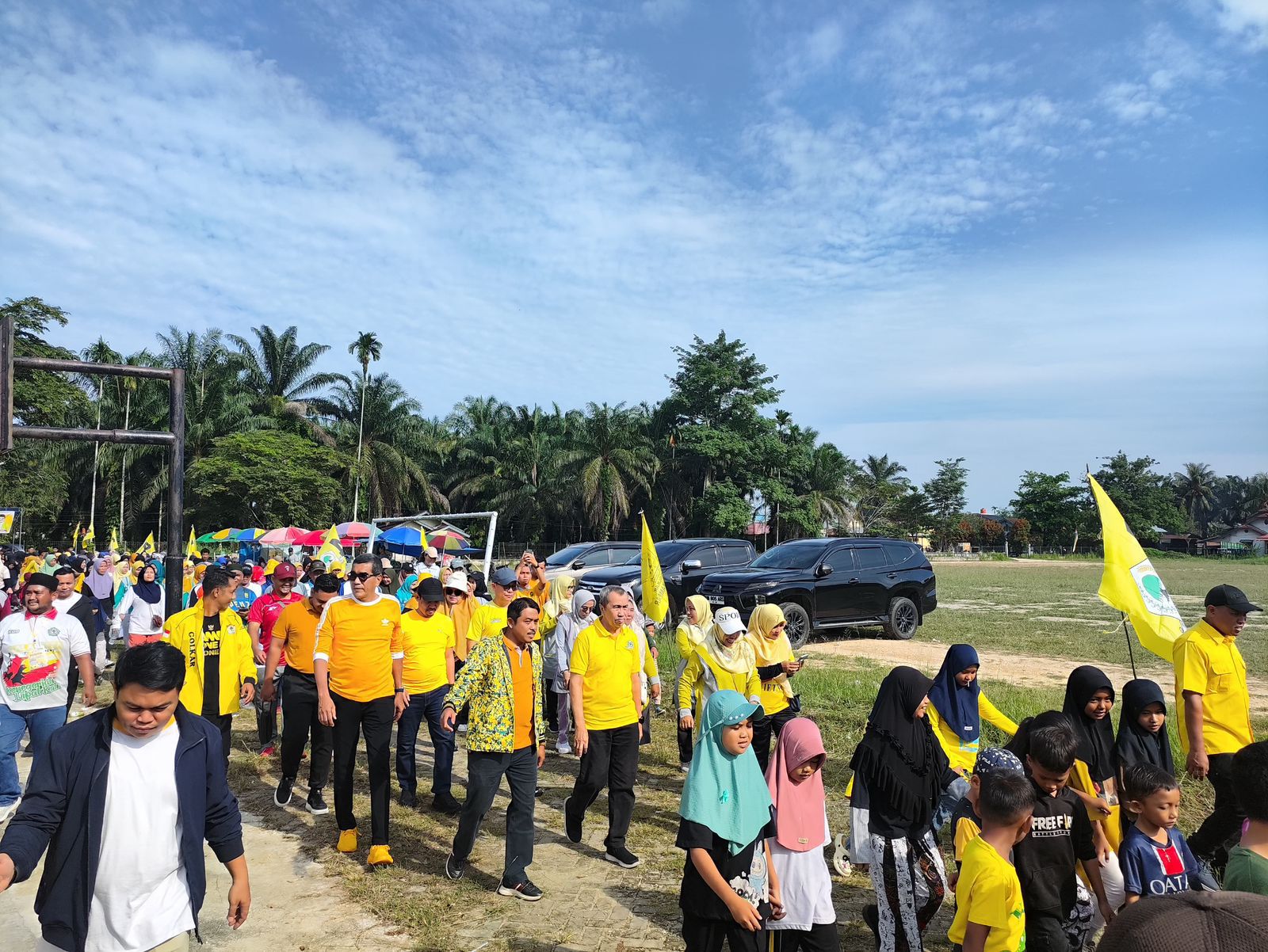 Ratusan warga tumpah ruah mengenakan pakaian olahraga kuning cerah, bersiap mengikuti jalan sehat yang digelar Dewan Pimpinan Daerah (DPD) Partai Golkar Kabupaten Kampar dalam rangka memperingati Hari Ulang Tahun (HUT) ke-61 Partai Golkar.