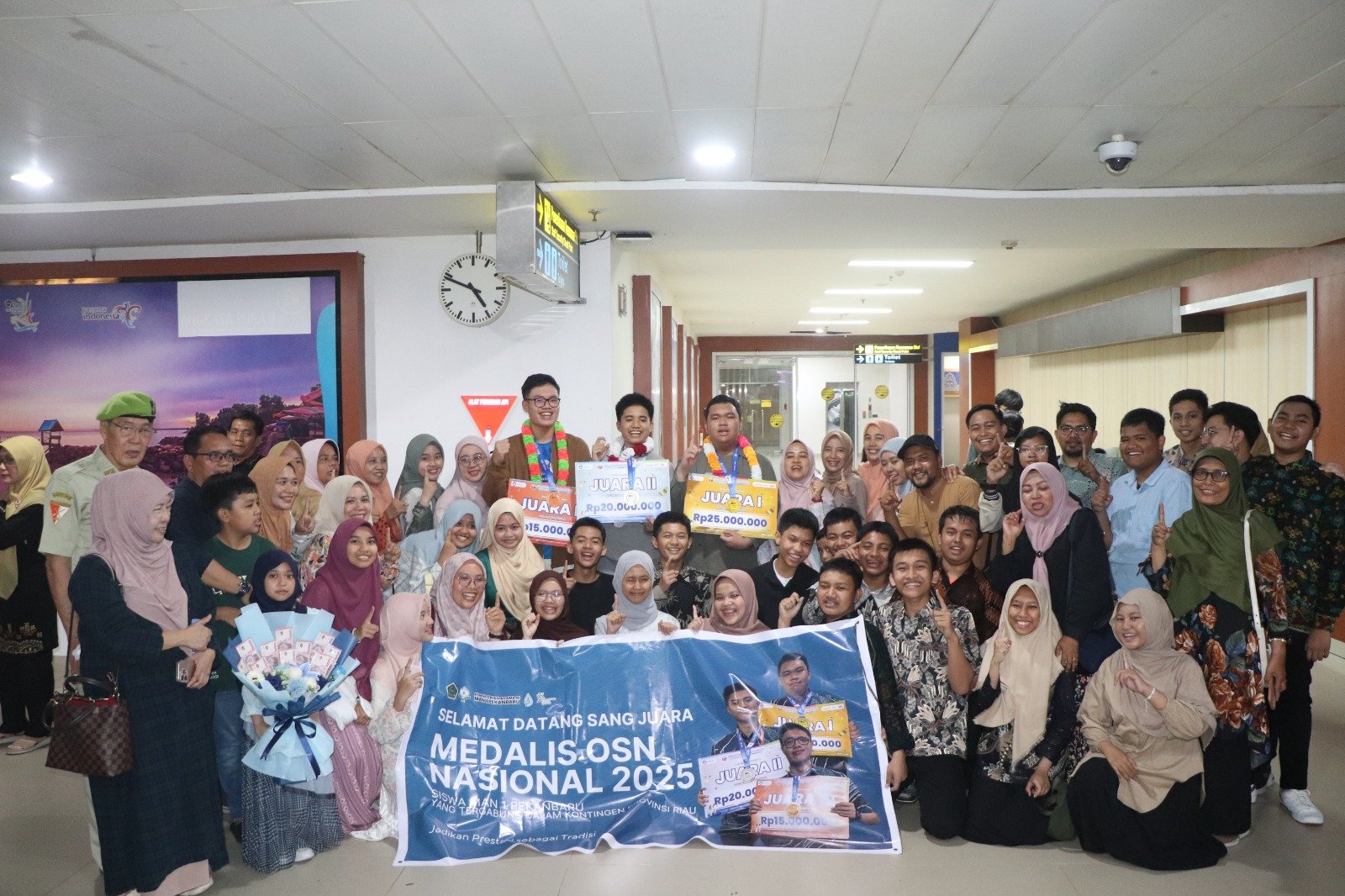 Lancang Kuning, PEKANBARU —Suasana haru dan bangga menyelimuti Terminal Kedatangan Bandara Sultan Syarif Kasim II Pekanbaru pada Ahad petang, (12/10/2025), saat ketibaan rombongan kontingen Provinsi Riau dari ajang Olimpiade Sains Nasional (OSN) Nasional 2025 tajaan Pusat Prestasi Nasional (Puspresnas) Kementerian Pendidikan Dasar dan Menengah (Kemendikdasmen) RI, di Universitas Muhammadiyah Malang (UMM) sejak 06-12 Oktober 2025.