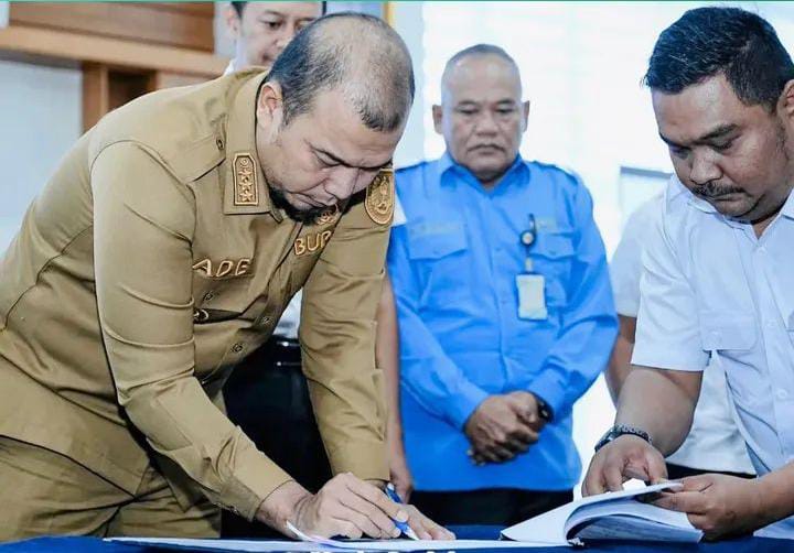 Foto: Bupati Inhu Ade Agus Hartanto saat menandatangani surat hibah pemberian aset dari Kementerian PU