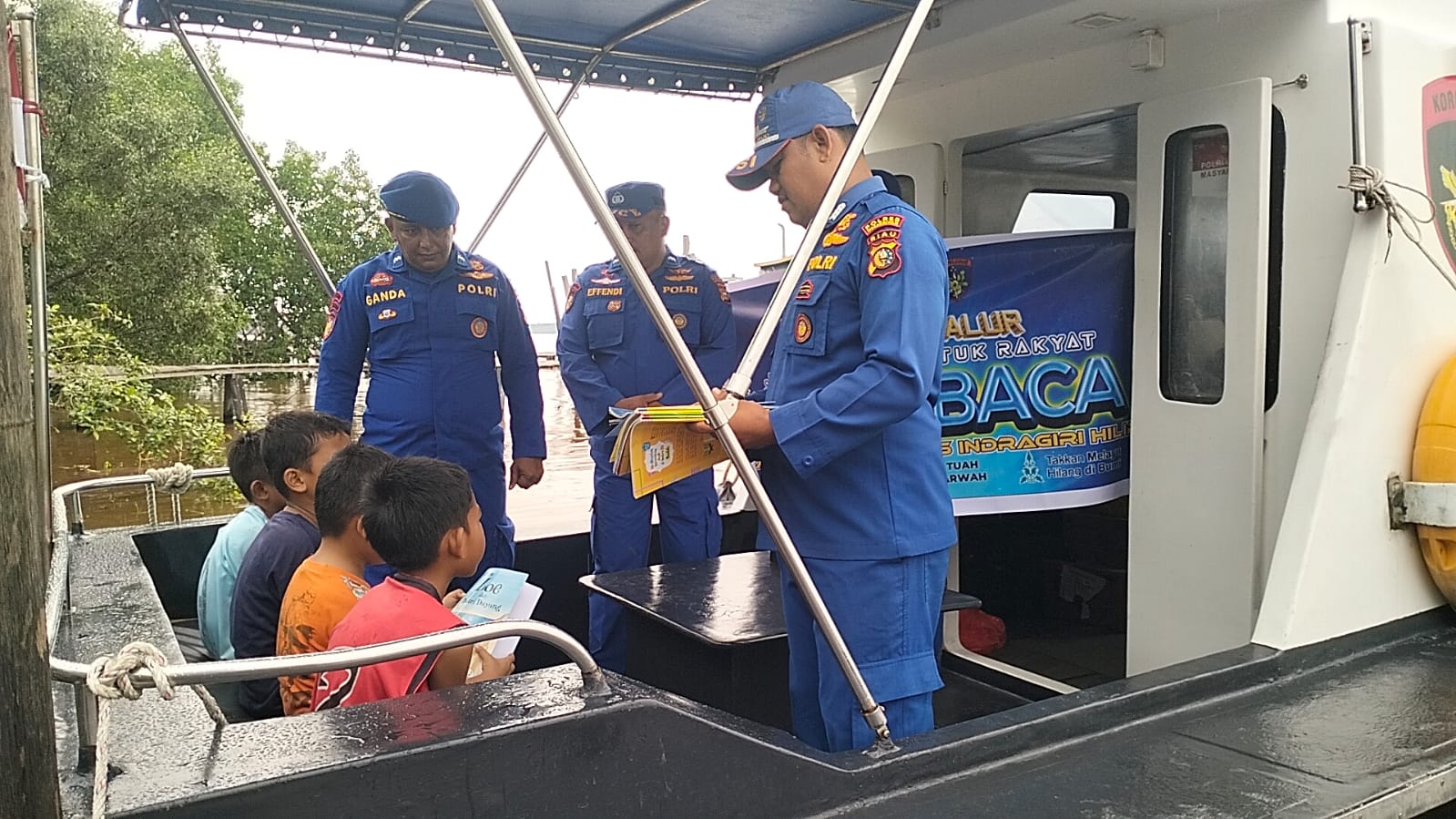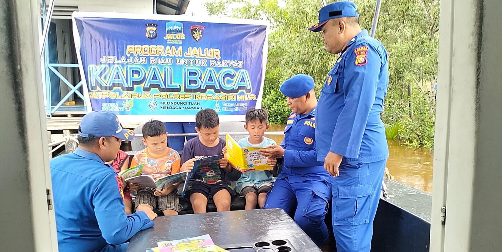 Melalui Pustaka Terapung, Satpolairud Polres Inhil menghadirkan buku-buku bacaan edukatif dan hiburan langsung ke tengah masyarakat pesisir.