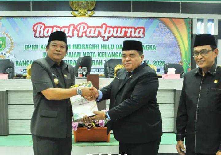 Foto: Wakil Bupati Indragiri Hulu, Hendrizal, menyampaikan secara resmi Pengantar Nota Keuangan dan Rancangan Peraturan Daerah tentang APBD Kabupaten Indragiri Hulu Tahun Anggaran 2026 pada Rapat Paripurna DPRD Inhu diterima langsung oleh Ketua DPRD Sabtu P. Sinurat