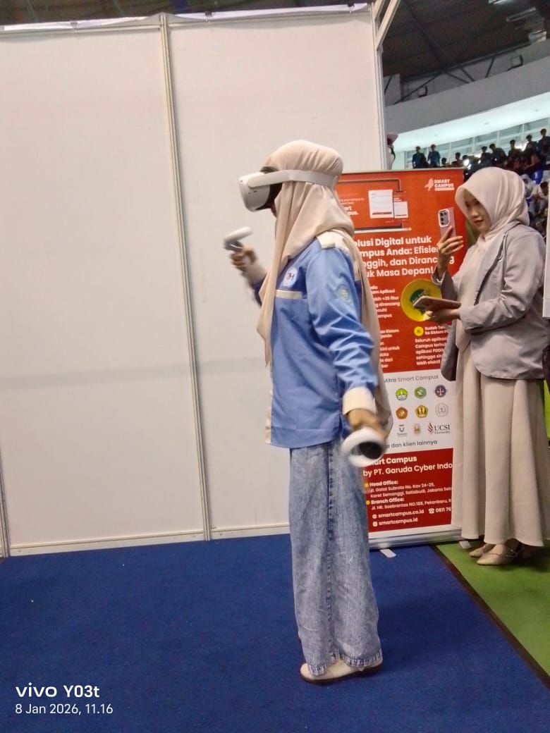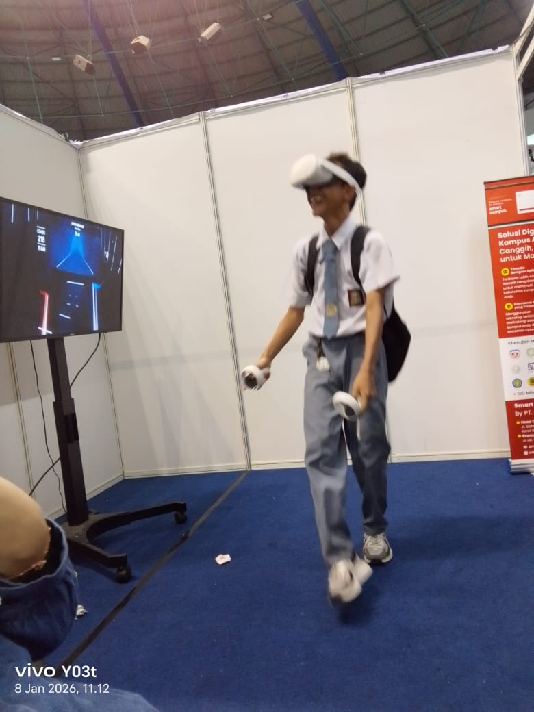 "Permainan ini namanya Beat Saber Virtual Reality, dan permainan serupa ini sangat diminati para peserta Riau Edutech Campus Summit 2026," ujar M Dhuha penanggung jawab both Garuda Cyber Indonesia.