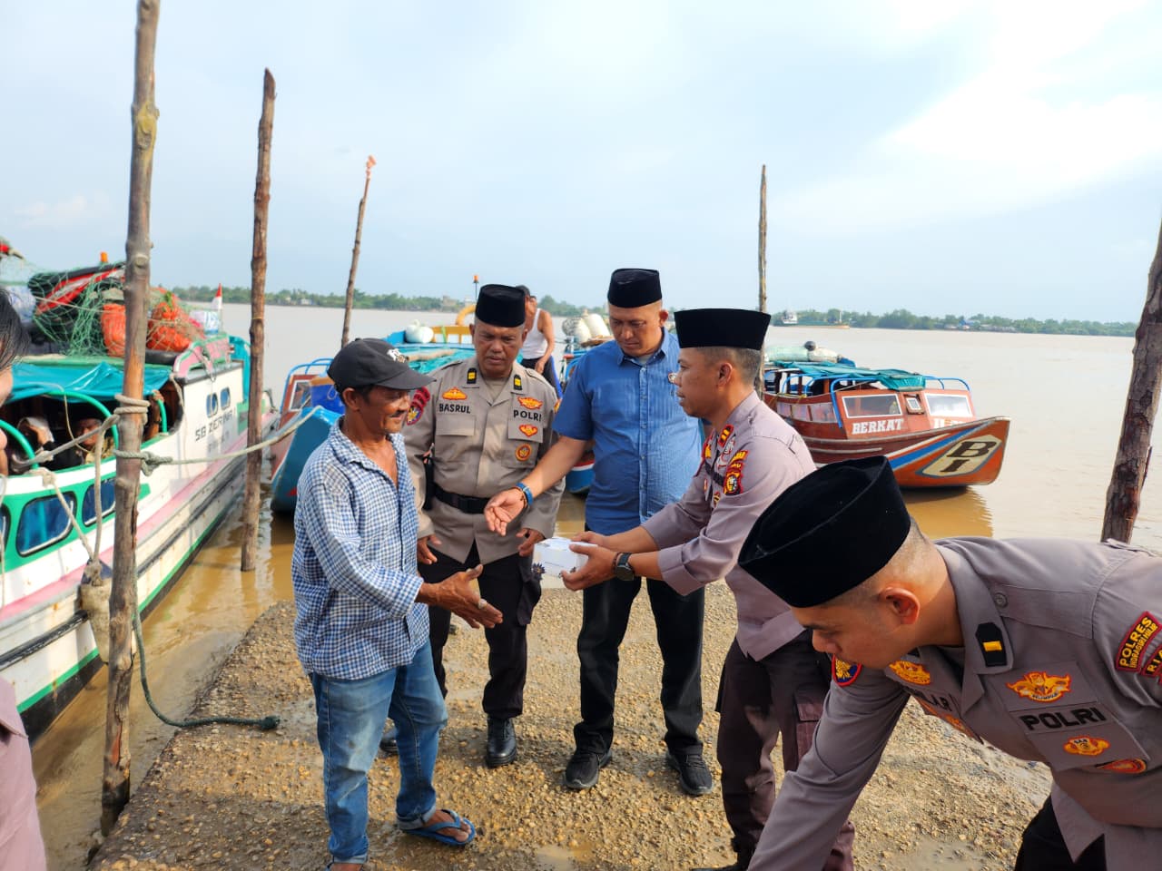 Foto: Pembagian takjik oleh Polres Inhil kepada para penumpang di pelabuhan Kuala Enok.