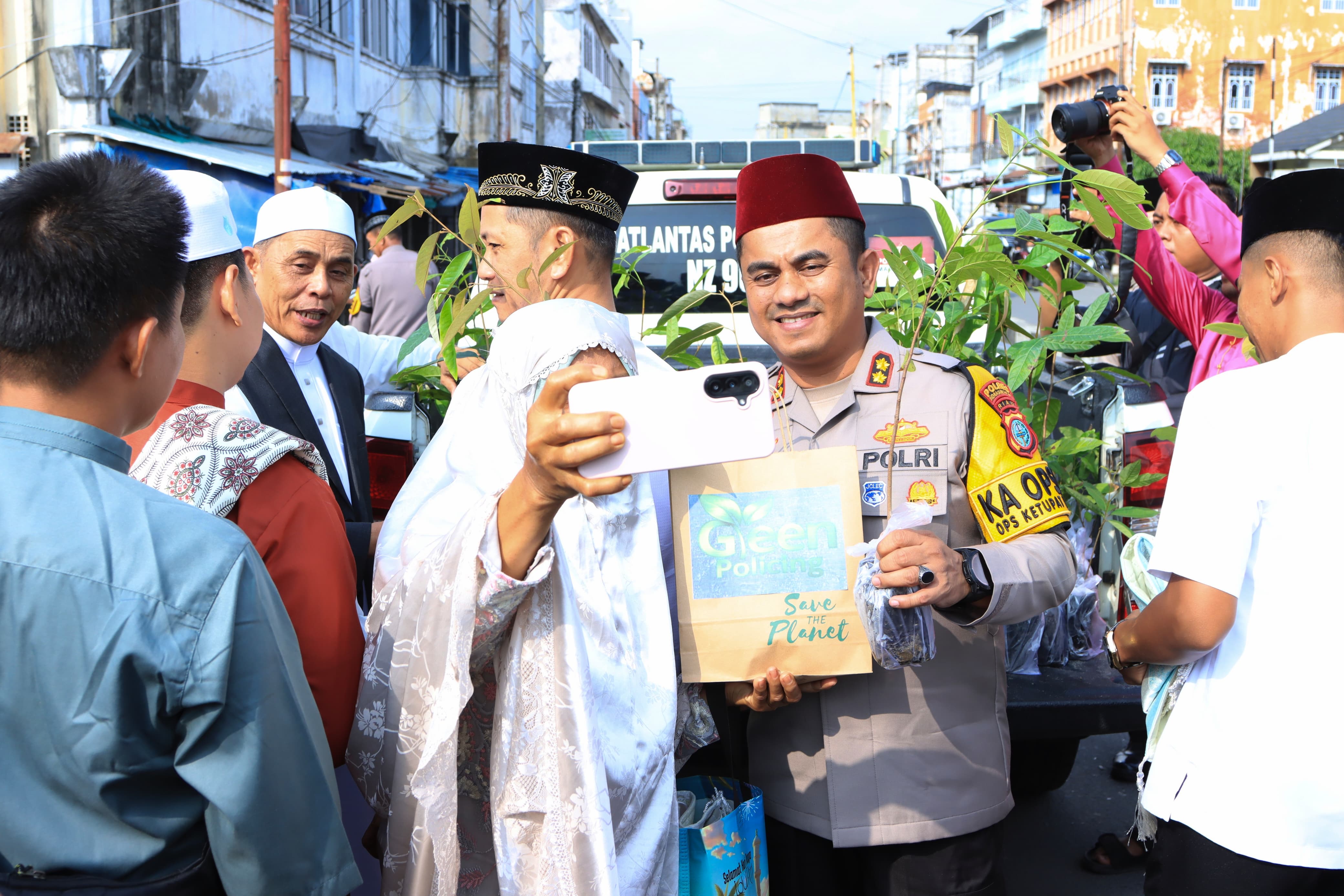 Foto: Kapolres Inhil membagikan bibit pohon kepada masyarakat usai sholat idul Fitri di masjid Al - Huda Tembilahan