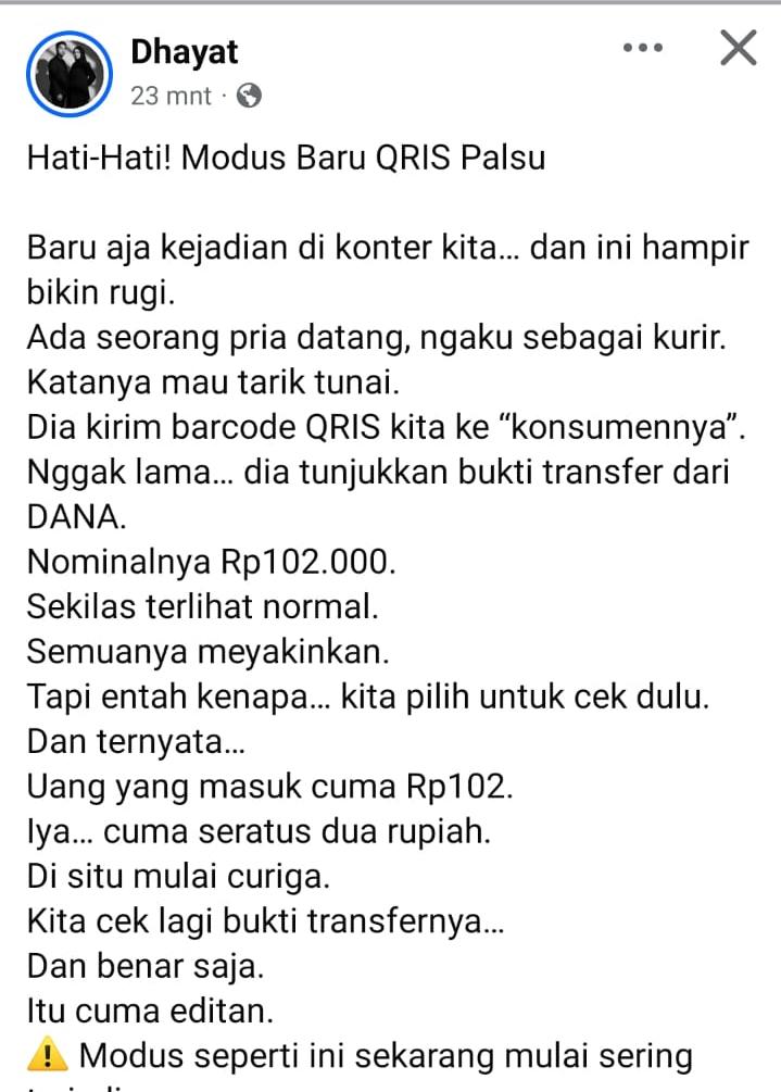 Lancang Kuning, INHIL – Seorang pemilik akun Facebook bernama Dhayat membagikan pengalaman mengejutkan yang nyaris membuatnya menjadi korban penipuan menggunakan QRIS palsu oleh orang tak dikenal (OTK).