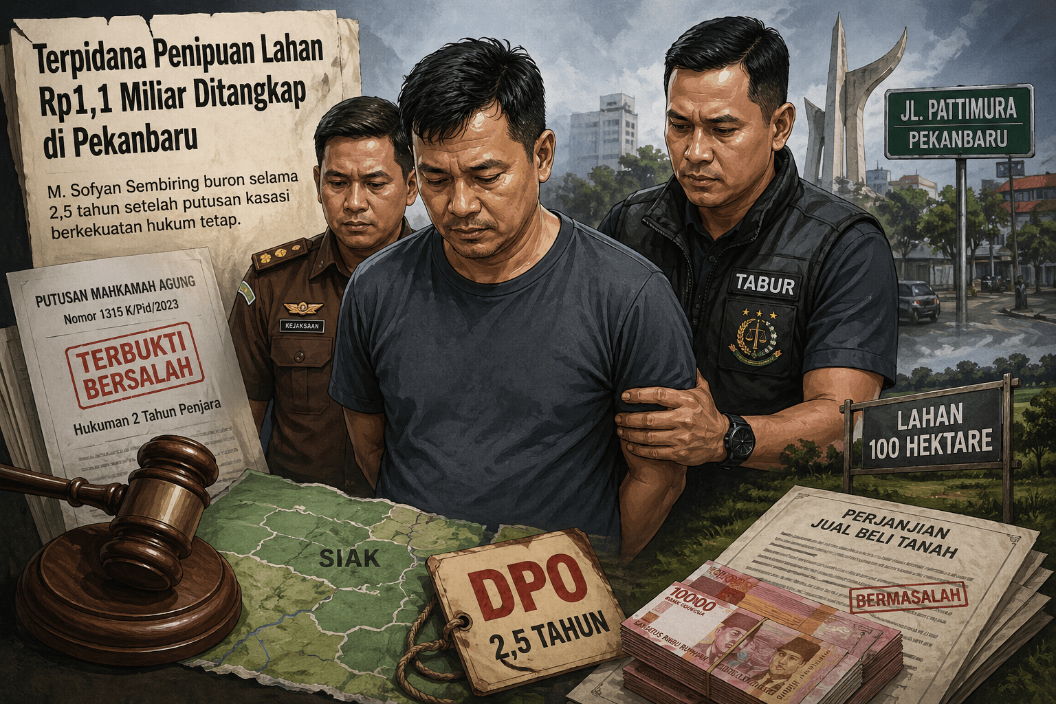 LANCANGKUNING.COM Pekanbaru-Pelarian panjang M. Sofyan Sembiring akhirnya terhenti. Terpidana kasus penipuan lahan senilai Rp1,1 miliar itu ditangkap Tim Satuan Tugas Tangkap Buronan (Tabur) Kejaksaan Tinggi Riau bersama Kejaksaan Negeri Siak, Kamis sore, 30 April 2026. Ia dibekuk di Jalan Pattimura, Pekanbaru, sekitar pukul 14.30 WIB tanpa perlawanan, setelah hampir dua setengah tahun masuk Daftar Pencarian Orang (DPO).